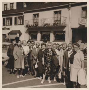 Schwarzweißfotografie. Das Bild zeigt den Bürgermeister der Stadt Bendorf, Georg Bauer zusammen mit Jahrgangsmitgliedern am 16. September 1965 bei einem Ausflug.