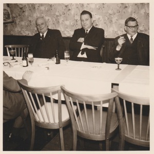 Schwarzweißfotografie. Der Bürgermeister der Stadt Bendorf, Georg Bauer (1949-1967) mit Karl Schön und Bernhard Henrich (von rechts nach links), Mitte der 1960er Jahre, an einem Tisch sitzend.