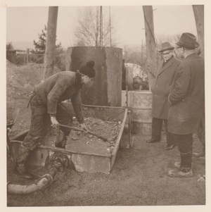 Schwarzweißfotografie. Das Bild zeigt den Bürgermeister der Stadt Bendorf, Georg Bauer (1949-1967) zusammen mit dem Wasserwerksleiter Wilhelm Krämer bei dem Besuch einer Baustelle Mitte der 1960er Jahre.
