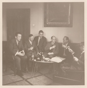 Schwarzweißfotografie. Der Bürgermeister der Stadt Bendorf, Georg Bauer (1949-1967) im Rathaus mit Karl Schön, Franz Schmidt, Gerhard Geissler und Theo Klostermann Mitte der 1960er Jahre.