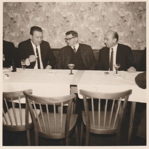Schwarzweißfotografie. Der Bürgermeister der Stadt Bendorf, Georg Bauer (1949-1967) sitzt zusammen mit Karl Schön (links im Bild) und Reinhard Heidrich an einem Tisch.