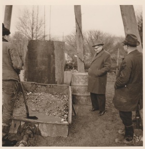Schwarzweißfotografie. Das Bild zeigt den Bürgermeister der Stadt Bendorf, Georg Bauer (1949-1967) zusammen mit dem Wasserwerksleiter Wilhelm Krämer bei dem Besuch einer Baustelle Mitte der 1960er Jahre.