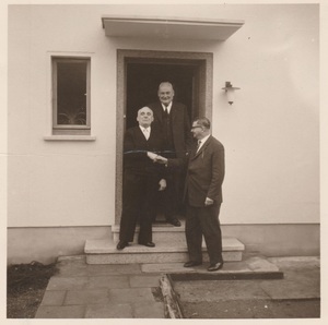 Schwarzweißfotografie. Der Bürgermeister der Stadt Bendorf, Georg Bauer gratuliert Bernhard Henrich und reicht ihm die Hand vor seinem Haus.