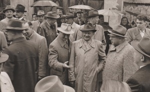 Schwarzweißfotografie. In der Mitte des Bildes, der Bürgermeister der Stadt Bendorf, Georg Bauer (1949-1967) bei einem Außentermin.