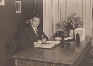 Schwarzweißfotografie. Der Bürgermeister der Stadt Bendorf, Georg Bauer (1949-1967) an seinem Schreibtisch. Es handelt sich um einen Aufnahme Ende der 1950er Jahre.