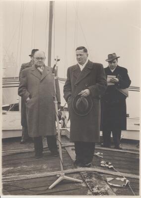 Schwarzweißfotografie. Der Bürgermeister der Stadt Bendorf von 1949 bis 1967, Georg Bauer bei der Übergabe des Motorschiffes "Stadt Bendorf" im Jahre 1955.