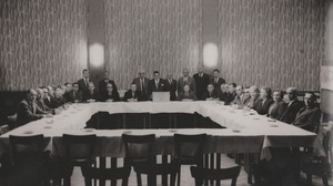 Schwarzweißfotografie. Der Bürgermeister der Stadt Bendorf von 1949 bis 1967, Georg Bauer mit dem Bendorfer Stadtrat und Mitarbeitern der Verwaltung im "Bendorfer Hof" um das Jahr 1960.