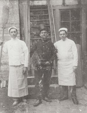 Schwarzweißfotografie. Der Bäcker Johann Wermerskirch (links auf dem Foto) neben einem Schornsteinfeger und weiteren Bäcker stehend. Er betrieb die Bäckerei "Wermerskirch" bis in die 1950er Jahre in der Unteren Vallendarer Strasse in Bendorf. Die beiden anderen Personen auf dem Bild sind nicht bekannt.