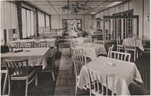 Schwarzweißfotografie als Postkarte. 1950er Jahre. Das Bild zeigt einen Speisesaal des "Hedwig Dransfeld-Hauses" in Bendorf. Es handelt sich um ein Erholungsheim des Katholischen Deutschen Frauenbundes. Die ehemalige Dr. Brosius'sche Anstalt ("Waldesruhe" 1878 gegründet) ging einige Jahre vor dem Ersten Weltkrieg durch Kauf in die Hände des Nervenarztes Dr. Zanke über, welcher größere Umbauten an den Hauptanstaltsgebäuden vornahm und plötzlich an den Folgen eines Unfalls verstarb. Unter seinem Nachfolger Dr. Döllner musste die Anstalt schließen. Die Hauptgebäude an der Hauptstraße gelangten durch Kauf in den Besitz der Bendorfer Getreidefirma Simon Abraham. Das schöne Besitztum Waldesruh kam nach mehrmaligem Besitzwechsel in die Hände des Kaufmanns E. Rezepka, der es mit erheblichen Kosten zu einem Erholungshaus ausbaute. Von diesem erwarben es die Jesuitenpatres. Nach Aufhebung der Niederlassung derselben kaufte es der Katholische Deutsche Frauenbund und wandelte es zu einem Frauen-Erholungsheim um. Zu Ehren der 1925 verstorbenen Frauenrechtlerin Hedwig Dransfeld wurde es im Jahre 1925 in "Hedwig Dransfeld-Haus" umbenannt. Seit dem Jahre 2008 befindet sich auf dem Anwesen das "Hotel friends".
