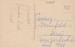 Farbfotografie als Postkarte aus dem Jahre 1958. Das Bild zeigt das nach der im Jahre 1925 verstorbenen Frauenrechtlerin Hedwig Dransfeld benannte "Hedwig Dransfeld-Haus" in Bendorf. Es handelt sich um ein ehemaliges Erholungsheim des Katholischen Deutschen Frauenbundes, das heute als Hotel genutzt wird. Kaspar Max Brosius (1825-1910) eröffnete 1857 seine erste eigene Heil- und Pflegeanstalt in Bendorf. 1863 kam durch Zukauf die sog. "Villa Sayn" dazu. Eine dritte Einrichtung begann Dr. Brosius 1878 am Eingang des Großbachtales auf ehemaligem Remy´schen Gelände zu errichten, die "Villa Waldesruhe". Während ins seiner "Central-Anstalt Bendorf" männliche und weibliche Kranke aufgenommen wurden, waren die "Villa Sayn" und die "Villa Waldesruhe" für nervenkranke Frauen und Mädchen bestimmt. Leitung über letztere übernahm Brosius Schwiegersohn Dr. Max Krell. Die Aufnahme von Nervenkranken erfolgte dort ab dem Jahr 1881. Die von Dr. Brosius geleiteten Anstalten erfreuten sich internationalen Rufes. Die Dr. Brosius'sche Anstalt ging einige Jahre vor dem Ersten Weltkrieg durch Kauf in die Hände des Nervenarztes Dr. Zanke über, welcher nachdem er größere Umbauten an den Hauptanstaltsgebäuden und der Villa Waldesruh vorgenommen, an den Folgen eines Unfalls starb. Unter seinem Nachfolger Dr. Döllner musste die Anstalt schließen. Die Hauptgebäude an der Hauptstraße gelangten durch Kauf in den Besitz der Bendorfer Getreidefirma Simon Abraham. Das schöne Besitztum Waldesruh kam nach mehrmaligem Besitzwechsel in die Hände des Kaufmanns E. Rezepka, der es mit erheblichen Kosten zu einem Erholungshaus ausbaute. Von diesem erwarben es die Jesuitenpatres. Nach Aufhebung der Niederlassung derselben kaufte es der Katholische Deutsche Frauenbund, welcher ein schmuckes Frauen-Erholungsheim aus ihm machte. Zu Ehren der 1925 verstorbenen Frauenrechtlerin Hedwig Dransfeld wurde es im Jahre 1925 in "Hedwig Dransfeld-Haus" umbenannt. Seit dem Jahre 2008 befindet sich auf dem Anwesen das "Hotel friends".