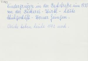 Schwarzweißfotografie. Das Bild zeigt eine Kindergruppe in der Bachstrasse vor der Bäckerei "Wirth" in Bendorf um das Jahr 1930. Später befand sich darin das Schuhgeschäft "Werner Jungen".