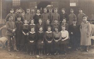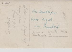 Postkarte. Druck einer schwarzweiß Fotografie, die eine Personengruppe vermutlich, während der Zeit des Ersten Weltkriegs oder danach in Bendorf zeigt. Die Bildmitte zeigt mehrere junge Frauen sitzend und stehend, eingerahmt von mehreren jungen Männern in Uniform. Der zweite von rechts ist Moritz Feist. Die Familie Feist war eine bekannte in Bendorf lebende jüdische Familie. Auf dem jüdischen Friedhof in Bendorf stehen einige Grabsteine für Mitglieder der Familie Feist (siehe 7.1004, 7.1031, 7.154, 7.1062, 7.1065).
