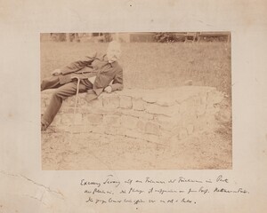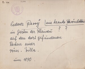 Schwarzweißfotografie aufgeklebt auf einer Pappe. Dieses Bild zeigt Exzellenz "Ravoy" im Garten der Wasserheilanstalt "Villa Rheinau", das von Dr. Albrecht Erlenmeyer 1866 gegründete Sanatorium für Nervenkranke in Bendorf. Sitzend auf den dort gefundenen Resten eines römischen Bades. Die Aufnahme entstand um das Jahr 1890.