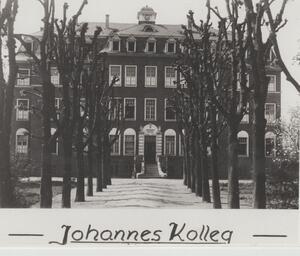 Schwarzweißfotografie. Dieses Foto wurde von der Straßenseite aufgenommen und zeigt das "Johannes-Kolleg" bzw. die ehemalige Kurvilla "Flora" um 1930 mit Baumallee, Freitreppe und Haupteingang. Die von Dr. Georg Colmant (1834-1897) um 1870-71 gegründete Kur- und Nervenheilanstalt im Andorf war nur weiblichen Patienten vorbehalten. Durch die günstige Entwicklung des Unternehmens wurde 1890 durch den Bau der "Villa Flora" an der Sayner Chaussee - heute Hauptstraße - mit schönen Parkanlagen, eine wesentliche Vergrößerung vorgenommen. Die Colmant'schen Anstalten schlossen kurz nach dem 1. Weltkrieg. Die sog. Villa Flora, von einer Ordensgenossenschaft erworben, wurde im Anschluss als Missions-Seminar unter dem Namen "Johannes-Kolleg" genutzt, von wo Missionare in alle Welt geschickt wurden. Nach deren Wegzug Mitte der 1930er Jahre, diente das Gebäude als Waisenhaus und später als Altersheim der Stadt Koblenz. Schon lange im Besitz der Didier-Werke, Bendorf, wohnten zuletzt hier Gastarbeiter. Im Jahre 1998 abgebrochen wurde die Grundstücksfläche als Teilfläche beim Bau eines großen Einkaufszentrums integriert.