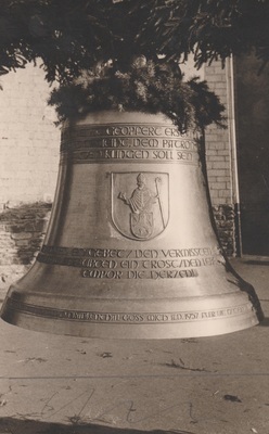 Schwarzweißfotografie. Die 1907 gerissene Medardusglocke, wurde umgegossen und kehrte aus dem Zweiten Weltkrieg nicht mehr zurück. Seit 1957 ergänzt die neue Medardusglocke das Geläut wieder auf drei Glocken. Die neue Glocke trägt folgende Inschrift: „IM KRIEG EINST GEOPFERT, ERSTAND ICH NEU. BIN ST. MEDARD GEWEIHT, DEM PATRON UNSERER STADT. MEIN KLINGEN SOLL SEIN: DEN TOTEN EIN GEBET, DEN VERMISSTEN EIN GRUSS, DEN HEIMATBERAUBTEN EIN TROST, DEN LEBENDEN MAHNUNG: - EMPOR DIE HERZEN! -"