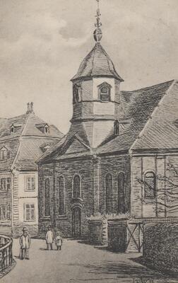 Postkarte aus dem Jahr 1912. Druck einer schwarzweißen Zeichnung, die die sog. Untere Kirche der Reformierten (heute: evangelischer Gemeindesaal) in Bendorf zeigt, die von der Familie Remy 1773/74 errichtet wurde. Am linken Bildrand ist das Wohnhaus des Johannes Remy erkennbar. Die Vorfahren der Bendorfer Unternehmerfamilie Remy waren aus Lothringen nach Deutschland eingewandert. Sie siedelten sich in Höhr-Grenzhausen an und waren dort im Töpferhandwerk tätig. Sie brachten ihren reformierten bzw. calvinistischen Glauben mit. Wilhelm Remy (1702-1761) schlug einen anderen Berufsweg ein und wandte sich dem Bergbau- und Eisenhüttenwesen zu. Innerhalb weniger Jahre stieg er vom Hüttenmeister zum Unternehmer auf und erhielt als landesherrliche Auszeichnung für seine Verdienste als Geschäftsmann im Eisenhüttenwesen 1729 den Titel „Faktor“ und einige Jahre später (1744) den Titel „Kommerzienrat“. Wichtig für seine Karriere war seine Heirat mit Maria Elisabeth Hoffmann, deren Vater im Eisengewerbe in Hachenburg tätig war und regen Handel mit Holland unterhielt. In den Jahren 1723-1724 wird die Lizenz zum Eisenerzabbau auf der „Loh“ in Bendorf erteilt und die Grube „Vierwinden“ auf der heutigen Vierwindenhöhe öffnet ihren Betrieb. 1730-40 gehen alle in der Bendorfer Gemarkung befindlichen Eisensteingruben in den Besitz von Wilhelm Remy über. Die Familie Remy baute das Eisenhüttenwesen im 18. Jahrhundert systematisch aus: Sie betreibt zeitweise zwei bzw. drei Schmelzhütten (Untere und Obere Hütte, Hammerhütte Steinebrück) in Bendorf mit dazugehörenden Erzgruben. Da die Remys wie auch alle anderen Mitglieder der reformierten Kirchengemeinde in Bendorf nicht das Recht zur freien Religionsausübung innehatten, mussten sie zur Messfeier nach Höhr-Grenzhausen fahren. 1747 erwirkte Johannes Remy (1713-1778), Vetter, Schwager und Nachfolger von Wilhelm Remy, vom Landesherrn für alle Zeiten das Recht zur freien Religionsausübung und man entschloss sich die sog. Untere Kirche der Reformierten 1773/74 zu erbauen.
