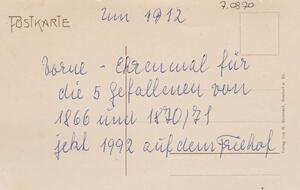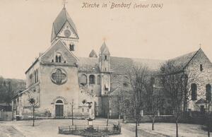 Postkarte aus dem Jahr 1912. Der Druck zeigt die Kirchen St. Medard in Bendorf und das davor auf dem Kirchplatz errichtete Kriegerdenkmal aus dem Jahre 1873. Heute steht die Steinsäule dieses Denkmals mit Sockel auf dem Friedhof in Bendorf. Der gusseiserne Adler mit ausgebreiteten Schwingen ist in der Dauerausstellung des Rheinischen Eisenkunstguss-Museums (Inv.-Nr. 4.507) ausgestellt. Das Kriegerdenkmal erinnerte an 5 gefallene Bendorfer Soldaten der Kriege von 1864 gegen Dänemark, 1866 gegen Österreich und 1870/71 gegen Frankreich.