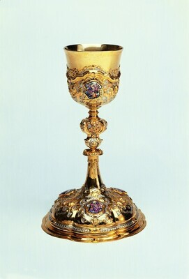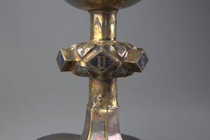 Der gotische Kelch folgt dem klassischen dreiteiligen Aufbau: aus dem breit ausladenden Fuß wächst ein schlanker Schaft mit einem Knauf (Nodus), welcher von einer Kuppa bekrönt ist. Typisch für die Gotik ist der Fuß sechspassförmig. Auf einem Passfeld findet sich ein Rundmedaillon mit eingraviertem Kreuz. Den Schaft zieren eingravierte Zickzack-Ornamente. Auf mittlerer Höhe des Schafts ist der Nodus, eine knaufartige Verdickung. Diesen zieren sechs Maßwerkfelder mit rautenförmigen Knöpfen, welche die sechs Buchstaben des Namen Jhesus tragen. Die Felder sind mit blauem Email belegt. Die hohe Kuppa ist schmucklos ausgeführt. In der christlichen Liturgie wurden Kelche zur Aufnahme des Messweins verwendet. Genau wie der Pokal ist der Kelch durch den hohen Fuß eine Würdeform. Im Mittelalter hatten Kirchen und Klöster reichen Grundbesitz in den pfälzischen Weingegenden. [Jonas Ehinger]