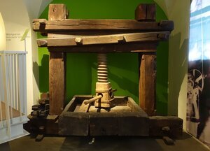 Einspindelkelter. Seitenpfosten mit abgefassten Kanten. Alles übrige ohne Zier. Mehrere Teile holzwurmlöchrig und beschädigt, so vor allem die Zapfenköpfe des oberen Gebälks. Altes und äußerst seltenes Exemplar der seit dem frühen Mittelalter in der Pfalz weit verbreiteten Form der Weinpressen in Form der Holzspindelkelter mit horizontalem Druckwerk und zentraler Spindel. Keltern wie diese waren in der Pfalz bis zum Ende des neunzehnten Jahrhunderts verbreitet, einzelne Exemplare blieben in modernisierter Version gar bis in die 1950er Jahre in Gebrauch. Der Bietkasten, in den die Trauben zum Pressen aufgeschüttet wurden, fehlt. Holzspindelkeltern wie diese waren in der Pfalz bis zum Ende des 19. Jahrhunderts noch weit verbreitet. Einzelne Exemplare blieben, oftmals mit einer eisernen Spindel modernisiert bis in die fünfziger Jahre unseres Jahrhunderts in Gebrauch. Gegenüber den Baumkeltern zeichneten sich die Holzspindelkeltern durch geringeren Platzbedarf und wesentlich einfachere Bedienung aus. Hier wurden die Trauben, die zuvor durch das Zerstampfen mit dem Mostkolben oder das Quetschen mit der Traubenmühle in ihrem Volumen bereits reduziert waren, in den ringsum durch Bretter (Setzdielen oder Seckerbretter) erhöhten Kelterkasten (Biet) geschüttet. Das Lesegut deckte man mit entsprechenden Legedielen ab, auf die wiederum einige Kanthölzer (Bracken), aufgesetzt wurden. Zum Schluss legte man einen breiten, schweren Eichenklotz auf (die Pfanne), auf die auch der eigentliche Pressdruck unmittelbar ausgeübt wurde. [Ludger Tekampe]