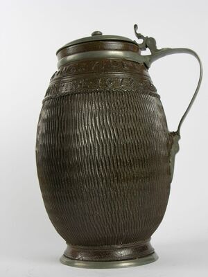 1611 entstand im hessischen Hanau die erste deutsche Fayencemanufaktur. Von dort stammt der hier abgebildete Weinkrug, der mit seinem birnenförmigen Gefäßkörper, dem hohen, nach oben hin breiter werdenden Hals und dem weitgeschwungenen Henkel genau dem gehobenen Zeitgeschmack reicher Bürger- und Adelshaushalte entsprach. Bemalt wurde der Krug in Nürnberg von dem dort als Hausmaler tätigen Künstler Abraham Hemhack. Der Weinkrug zeigt eine Ansicht des südpfälzischen Neuburg am Rhein; als Vorlage diente ein Kupferstich von Matthäus Merian. In Speyer schließlich erhielt der Krug einen vergoldeten Silberdeckel und einen Fußring desselben Materials. In den Deckel sind die Meistermarke des Goldschmieds Johannes Schmidt und das Zeichen der Speyerer Goldschmiede eingeschlagen. Johannes Schmidt ist als Goldschmied in Speyer von 1679 bis 1689 nachweisbar. Die von Abraham Helmhack in Schwarzlot ausgeführte Bemalung des Kruges zeigt neben der Topographie des Ortes an der Lautermündung mit der Ruine der Zollburg und der auf dem Hochufer gelegenen Kirche auch Szenen aus dem Volksleben des ausgehenden siebzehnten Jahrhunderts: Ein Fährboot setzt Leute über den Fluss, und im seichten Uferbereich geht ein Mann mit einem Kescher auf Fischfang. [Ludger Tekampe]