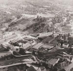 Schwarzweißfotografie. Dieses Foto zeigt eine Luftaufnahme der Firma "Gebr. Lüngen", gelegen an der Hauptstrasse in Bendorf zwischen dem Hellenpfad und der Trasse der ehemaligen Westerwaldbahn. Im Vordergrund ist der Bahnübergang und die 1895 gegründete Maschinenfabrik Syré (heute: Firma Falk) zu erkennen. Die Firma "Gebr. Lüngen" ging aus der 1842 von Theodor Neitzert (1814-1883) gegründeten Fabrik für feuerfeste Steine hervor. Theodor Neitzert hatte zuerst eine Kalk- und Ziegelbrennerei aufgebaut und stellt ab 1861 feuerfeste Steine (Schamottsteine) her. Aus dieser Fabrik gingen die späteren Rheinischen Schamott- und Dinaswerke und schließlich Didier-Werke AG hervor. Die Firma lag bzw. liegt noch heute an der 1836 erbauten "Sayner Chaussee" (heute Hauptstrasse), die Bendorf mit Sayn und dem Westerwald verbindet. Die heutige AS Lüngen GmbH stellt Speiser her und gehört zur ASK Chemicals Group.