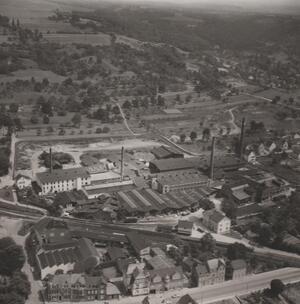 Schwarzweißfotografie. Diese Luftaufnahme zeigt das Geländes der Firma Gebrüder Lüngen, die an der Hauptstrasse in Bendorf zwischen dem Hellenpfad und der Trasse der ehemaligen Westerwaldbahn gelegen ist. Im Vordergrund links, unmittelbar am Bahnübergang befindet sich die 1895 gegründete Maschinenfabrik Syré (heute: Firma Falk). Die Firma Lüngen ging aus der 1842 von Theodor Neizert gegründeten Fabrik für feuerfeste Steine hervor. Theodor Neizert (1814-1883) hatte zuerst eine Kalk-und Ziegelbrennerei aufgebaut und stellt ab 1861 Schamottsteine her. Aus dieser Fabrik ging die Firma "Theodor Neizert & Co" später "Bendorfer Actien-Gesellschaft für Feuerfeste Produkte in Bendorf" hervor, die schließlich in den Firmen Didier und Gebr. Lüngen aufging. Die Firma lag bzw. liegt noch heute an der 1836 erbauten "Sayner Chaussee" (heute Hauptstrasse), die Bendorf mit Sayn und dem Westerwald verbindet. Die heutige AS Lüngen GmbH stellt Speiser her und gehört zur ASK Chemicals Group.