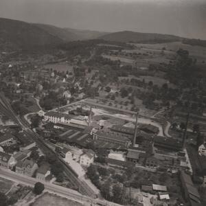 Schwarzweißfotografie, leicht unscharf. Diese Luftaufnahme zeigt das Geländes der Firma Gebrüder Lüngen, die an der Hauptstrasse in Bendorf zwischen dem Hellenpfad und der Trasse der ehemaligen Westerwaldbahn gelegen ist. Die Firma Lüngen ging aus der 1842 von Theodor Neizert gegründeten Fabrik für feuerfeste Steine hervor. Theodor Neizert (1814-1883) hatte zuerst eine Kalk-und Ziegelbrennerei aufgebaut und stellt ab 1861 Schamottsteine her. Aus dieser Fabrik ging die Firma "Theodor Neizert & Co" später "Bendorfer Actien-Gesellschaft für Feuerfeste Produkte in Bendorf" hervor, die schließlich in den Firmen Didier und Gebr. Lüngen aufging. Die Firma lag bzw. liegt noch heute an der 1836 erbauten "Sayner Chaussee" (heute Hauptstrasse), die Bendorf mit Sayn und dem Westerwald verbindet. Die heutige AS Lüngen GmbH stellt Speiser her und gehört zur ASK Chemicals Group.
