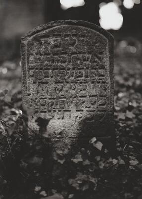Schwarzweißfotografie. Dieses Bild zeigt einen Grabstein auf dem jüdischen Friedhof in Bendorf. Der Grabstein trägt eine in Stein gemeißelte Inschrift aus hebräischen Schriftzeichen. Den oberen Grabsteinabschluss bildet ein Stichbogen. Der Jüdische Friedhof in Bendorf wurde um das Jahr 1700 angelegt und 1913 erweitert. Er liegt östlich der Stadt im Wenigerbachtal und ist ein geschütztes Kulturdenkmal. Der Friedhof wurde in der Zeit des Nationalsozialismus sowie im Jahr 1999 geschändet. Auf dem 7032 m² großen Friedhof sind noch 116 Grabsteine erhalten.