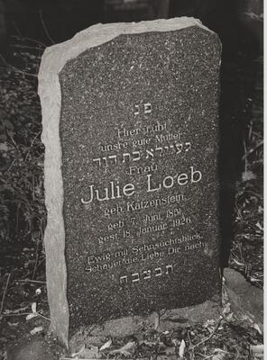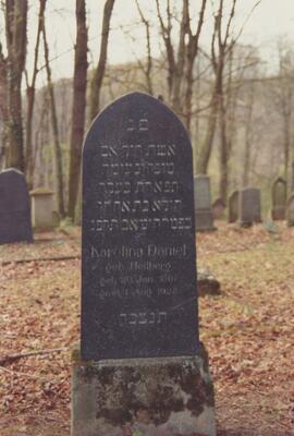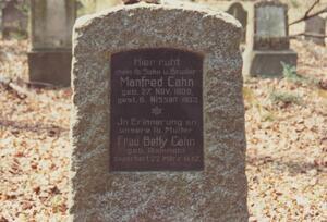 Schwarzweißfotografie. Dieses Bild zeigt den Grabstein einer Mutter und ihres Sohnes, Manfred und Betty Cahn, auf dem jüdischen Friedhof in Bendorf. Den oberen Grabsteinabschluss bildet ein Stichbogen. Der Grabstein trägt folgende Inschrift: "Hier ruht mein lb. Sohn und Bruder Manfred Cahn geb. 27. Nov. 1908, gest. 6.Nissan 1933". "In Erinnerung an unsere lb. Mutter Frau Betty Cahn, geb. Reinhold deportiert 22. März 1942." Nach Angaben von Dietrich Schabow wurde Betty Cahn mit dem ersten großen Transport von Juden aus dem Kreis Koblenz am 22.3.1942 in die Vernichtungslager nach Osten transportiert. Sie war 1881 geboren und lebte in der Bachstraße 1 in Bendorf. Der Jüdische Friedhof in Bendorf wurde um das Jahr 1700 angelegt und 1913 erweitert und mit einem neuen Treppenaufgang versehen. Er liegt östlich der Stadt im Wenigerbachtal und ist ein geschütztes Kulturdenkmal. Der Friedhof wurde in der Zeit des Nationalsozialismus sowie im Jahr 1999 geschändet. Auf dem 7032 m² großen Friedhof sind noch 116 Grabsteine erhalten.