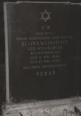 Schwarzweißfotografie. Dieses Bild zeigt den Grabstein von Felix Herz Helene auf dem jüdischen Friedhof in Bendorf. Der Grabstein trägt folgende in den Stein gemeißelte Inschrift in lateinischer Schrift: Unsere unvergessliche treusorgende Gattin und Mutter Frau Felix Herz Helene geb. Abraham geb. 17.10.1888 zu Bendorf gest. 23.10.1918 zu Nauheim