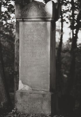 Schwarzweißfotografie. Dieses Bild zeigt die nebeneinanderstehenden Grabsteine von Sybilla und Simon Abraham auf dem jüdischen Friedhof in Bendorf. Der obere Teil der Grabsteine trägt eine in den Stein gemeißelte Inschrift aus hebräischen Schriftzeichen. In lateinischer Schrift darunter folgende Inschriften: Linker Grabstein: Dem Andenken unseres unvergesslichen theuren Gatten und Vaters des Herrn Simon Abraham gestorben am 26. August 1883 im Alter von....Jahren (Inschrift teilweise nicht lesbar) Rechter Grabstein: Hier ruht unsere theure und unvergessliche Mutter Frau Sybilla Abraham, geb. Franck gestorben im Alter von 75 Jahren am 26. Nov. 1896...(Inschrift teilweise nicht lesbar) Der Jüdische Friedhof in Bendorf wurde um das Jahr 1700 angelegt. Er liegt östlich der Stadt im Wenigerbachtal und ist ein geschütztes Kulturdenkmal. Der Friedhof wurde in der Zeit des Nationalsozialismus sowie im Jahr 1999 geschändet. Auf dem 7032 m² großen Friedhof sind noch 116 Grabsteine erhalten.