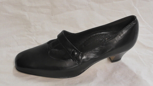 Eine einzelne Damensandalette aus hellblauem Kunstleder. Eckige Form, mit Kunstleder bezogener Pfennigabsatz (ca. 5,5cm) mit Metallspitze, ein Knöchelriemen mit Schnalle dient der Befestigung. Hergestellt von der Firma Salamander in Kornwestheim (D). Leider sehr ungenau datiert.