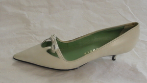 Eine einzelne Damensandalette aus beigem Kunstleder. Spitze Form, mit Kunstleder bezogener Pfennigabsatz (ca. 5,5cm) mit Metallspitze, ein Riemen mit Schnalle dient der Befestigung. Der Schuh ist mit einer Zierschleife aus Kunstleder versehen. Hergestellt von der Firma Salamander in Kornwestheim (D). Leider sehr ungenau datiert.