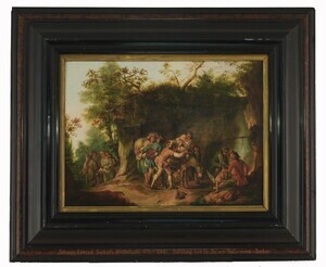 Alte Inventarnummer: BS_3088) Menschen ohne festen Wohnsitz wurden im 18. Jh. gerne als Briganten oder "fahrendes Volk" bezeichnet. Unter Briganten (von italienisch brigare „kämpfen, streiten“) war ein Sammelbegriff für Gesetzlose, "Gesindel", Räuber oder Personen, die im Zuge kriegerischer Auseinandersetzungen die Gegend durchstreiften und die Zivilbevölkerung durch Plündern, Vergewaltigen und Brandschatzen terrorisierten. Die Darstellung dieser undefinierten sozialen Gruppen war häufiges Motiv des Malers Friedrich Müller. Eine kleine Gruppe von Menschen rastet im Wald. Während sich im Vordergrund ein alter Mann mit seiner Pfeife niedergelassen hat, dem sich ein jüngerer Mann mit Gewehr und Hund nähert, steht auf der rechten Bildseite eine Gruppe mit Schimmel und einer Frau mit zwei Kindern im Zentrum des Geschehens. Im Vordergrund fliest ein kleiner Bach. Müller wuchs in Kreuznach auf. Über seine Mutter Katharina Margaretha Roos (1730–1796) war er ein Urenkel des Tiermalers Johann Heinrich Roos. Er wurde Schüler der Hofmaler Johann Christian von Mannlich und Daniel Hiens und studierte ab 1769 an der Kunstschule in Mannheim. Kurfürst Karl Theodor ernannte ihn zu seinem Kabinettsmaler. Müller hatte Verbindungen zu J.W. Goethe, Gotthold Ephraim Lessing, Christoph Martin Wieland und Friedrich Schiller. Goethe vermittelte ein Stipendium des Weimarer Kreises. Auch aus Mannheim wurde er unterstützt. Daraufhin reiste Müller 1778 nach Rom, wo er bis an sein Lebensende blieb und in ärmlichen Verhältnissen lebte. Da seit 1789 die anfangs noch erhaltenen Zahlungen aus Mannheim und Weimar ausblieben, war er in Rom als Journalist für verschiedene deutschsprachige Zeitschriften und als Fremdenführer tätig. Die Unterstützung aus Weimar endete durch ein negatives Gutachten seitens Goethes, der die übersandten "Sachen" eigentlich nur noch gestammelt seien und er sich eine Zeitlang aller Götter, Engel und Teufel enthalten solle. Aufgrund der Zurechtweisung brach Müller den Kontakt zu Goethe ab. (siehe Mathern S. 41). 1805 war er Fremdenführer des bayerischen Kronprinzen und späteren Königs Ludwig I., der ihm den Titel eines königlich bayerischen Hofmalers verlieh und ihm eine Pension aussetzte. In Rom war Müller weiterhin auch als Dichter tätig. siehe auch https://de.wikipedia.org/wiki/Maler_M%C3%BCller
