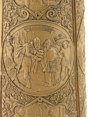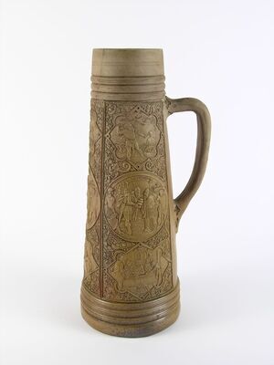 Schnelle ohne Zinnmontierung. Eine Schnelle ist ein sich nach oben verjüngender, zylindrischer Krug. Der Krug ist durch Salzglasur teilweise gelblich gefärbt. Auf der Wandung sind drei hochrechteckige Auflagen derselben Matrize: In dem Rundmedaillon in der Mitte und in den übereck gestellten nahezu quadratischen Feldern oben und unten (mit Rundungen in den Seitenmitten). Es handelt sich um Darstellungen aus dem Alten Testament. Oben: Opfer Isaaks mit Künstlermonogramm P.D. Mitte: Priesterkönig Melchisedech und ein Heerführer. Mit Inschriftband: "Melchisedech". Unten: Gastmahl Abrahams für die beiden Engel. In den Zwickeln Blattranken und Füllhörner. Der Henkel ebenfalls mit Auflage, mit der Darstellung von zwei Kirchen und einem Heiligen.