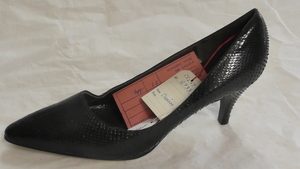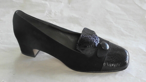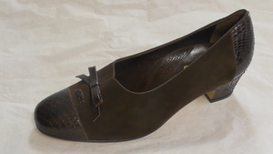 Ein einzelner Pumps aus beigem Nubukleder und Schlangenleder-Imitat. Eckige Form, mit Schlangenleder-Imitat bezogener und metallgenagelter Absatz (ca. 5,5cm), ein Knöchelriemen mit Schnalle dient der Befestigung. Der Schuh ist mit einem Zierknopf versehen, welcher mit Schlangenleder-Imitat bezogen ist. Hergestellt von der Firma Salamander in Kornwestheim (D). Leider sehr ungenau datiert.