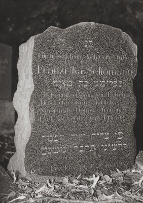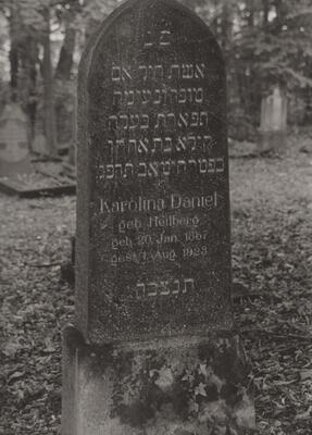 Schwarzweißfotografie. Diese Aufnahme zeigt den Grabstein für Julie Loeb auf dem jüdischen Friedhof in Bendorf. Er trägt eine in Stein gemeißelte Inschrift aus hebräischen und lateinischen Schriftzeichen: "Hier ruht unsere gute Mutter Frau Julie Loeb, geb. Katzenstein geb. 7. Juni 1851 gest. 18. Januar 1926 Ewig mit Sehnsuchtsblick, Schauet die Liebe Dir nach." Der Jüdische Friedhof in Bendorf wurde um das Jahr 1700 angelegt. Er liegt östlich der Stadt im Wenigerbachtal und ist ein geschütztes Kulturdenkmal. Der Friedhof wurde in der Zeit des Nationalsozialismus sowie im Jahr 1999 geschändet. Auf dem 7032 m² großen Friedhof sind noch 116 Grabsteine erhalten.