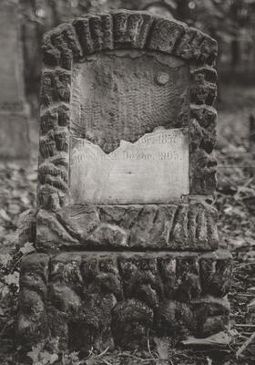 Schwarzweißfotografie. Dieses Bild zeigt einen stark verwitterten Grabstein auf dem jüdischen Friedhof in Bendorf. Die Inschrift ist aufgrund des Verfalls nicht mehr lesbar. Der Jüdische Friedhof in Bendorf wurde um das Jahr 1700 angelegt. Er liegt östlich der Stadt im Wenigerbachtal und ist ein geschütztes Kulturdenkmal. Der Friedhof wurde in der Zeit des Nationalsozialismus sowie im Jahr 1999 geschändet. Auf dem 7032 m² großen Friedhof sind noch 116 Grabsteine erhalten.