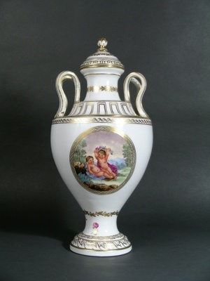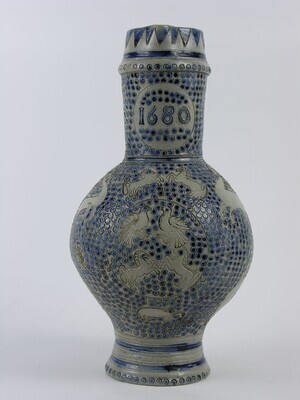 Weinkrug mit kurzem, sehr eingezogenem Fuß und kräftiger, kugelförmiger Bauchung. Der Hals ist hoch und eng. Der Henkel ist weit ausgebogen. In der Mitte vorne ist ein großer, blau gemalter Blütenzweig bestehend aus einer großen Blüte und drei großen Blättern. Am Hals sind zwischen je zwei dünnen Profilringen, zwei gemalte, breitere, blaue Ringe. Der Henkelansatz ist mit blauer Farbe umzogen und hat die Nummer "5" aufgeschrieben.