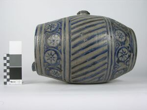 Durch die Rumpfmitte, vom Spundloch unterbrochen, läuft ein breiter von schrägen Blaustrichen gebildeter Streifen. Durch je zwei gemalte blaue Linien und eingepresste Linien von diesem Streifen getrennt, je eine breite Borde aus eingeritzten Blütengirlanden an den Rumpfseiten. Die Sternblumen dieser Ranken und der Grund der Borde sind blau ausgemalt. An den Rumpfrändern wiederum geritzte und gemalte Doppellinien. Auf dem vorderen Boden eine blaugrundierte Scheibe, in der die Jahreszahl "1750" und ein die Scheibe füllendes Schlangenornament eingeritzt sind. Auf dem hinteren Boden ein Blütenzweig mit sechs Blüten auf blauem Grund. Zapfspundloch vorne und Spundloch oben mit Profilrand abgeschlossen.
