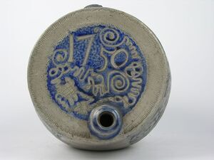 Durch die Rumpfmitte, vom Spundloch unterbrochen, läuft ein breiter von schrägen Blaustrichen gebildeter Streifen. Durch je zwei gemalte blaue Linien und eingepresste Linien von diesem Streifen getrennt, je eine breite Borde aus eingeritzten Blütengirlanden an den Rumpfseiten. Die Sternblumen dieser Ranken und der Grund der Borde sind blau ausgemalt. An den Rumpfrändern wiederum geritzte und gemalte Doppellinien. Auf dem vorderen Boden eine blaugrundierte Scheibe, in der die Jahreszahl "1750" und ein die Scheibe füllendes Schlangenornament eingeritzt sind. Auf dem hinteren Boden ein Blütenzweig mit sechs Blüten auf blauem Grund. Zapfspundloch vorne und Spundloch oben mit Profilrand abgeschlossen.