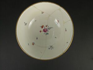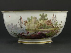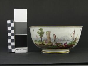 Ein Kumpen mit abgesetztem Fußring. Der obere Rand ist golden und mit gefülltem Bogensaum verziert, der untere Rand mit einem einfachen Goldrand. Dargestellt sind zwei Seelandschaften. Bei beiden im Vordergrund prominent die Segelschiffe mit Schiffmasten und roten Mastwimpeln. Daneben links eine Ruine mit Rundturm. Im Hintergrund blaue Berge und eine Hafenstadt. Im anderen Bild ist im Hintergrund des Segelschiffs, dass direkt am Ufer liegt, eine Felseninsel mit Turmresten zu sehen. Links im Hintergrund am Ufer sind Gebäude. Auf den Wiesen vor dem See, spazierengehende und sitzende Paare. Innen ist der Kumpen mit Streublumen verziert.