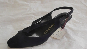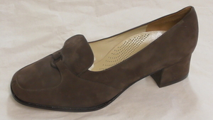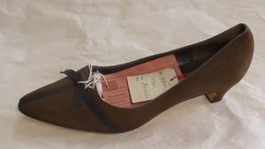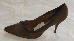 Ein einzelner Riemenpumps aus lilafarbenem und orangenem Nubukleder. Eckige Form, mit Nubukleder bezogener und metallgenagelter Absatz (ca. 3cm), ein Knöchelriemen mit Schnalle dient der Befestigung. Der Schuh ist mit einer Zierschleife aus Nubukleder und dem originalen Fabrikanhänger versehen. Hergestellt von der Firma Salamander in Kornwestheim (D). Leider sehr ungenau datiert.