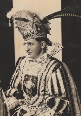 Schwarzweißfotografie. Diese Aufnahme zeigt Prinz Helmut I. von Hohenzollern (Helmut Zöller). Er war Karnevalsprinz im Bendorfer Karneval im Jahre 1956.