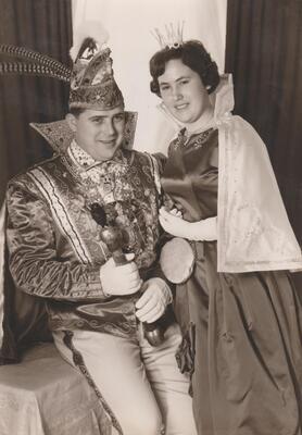 Schwarzweißfotografie. Diese Aufnahme zeigt Prinz Franz-Josef I. (Franz-Josef Malkmus) und Prinzessin Gertrud I. von der Ohlenburg (Gertrud Wambach), Prinzenpaar in der Bendorfer Karnevalssession 1961.