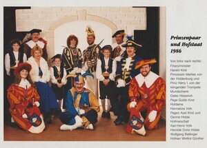 Farbfotografie. Das Prinzenpaar der Karnevalssession 1986 in Bendorf, Prinz Harry I. von der klingenden Trompete (Harry Hidde) und Prinzessin Marlies von der Hiddenburg (Marlies Kirst, geb. Hidde).