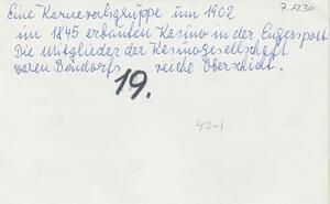 Schwarzweißfotografie. Diese Aufnahme um 1900 zeigt eine Gruppe von Karnevalisten Bendorfer Casino (erbaut 1845). Die Mitglieder der bereits im Jahre 1823 gegründeten Casinogesellschaft gehörten dem Bürgertum an. Die Casinogesellschaft veranstaltete alljährlich Maskenfeste innerhalb des Vereins. Auf dem Foto sind verschiedene Männer mit Hut und Patronengurt als Buren verkleidet, die um die Jahrhundertwende große Sympathie genossen.