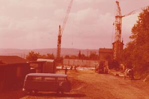 Farbfotografie. Diese Aufnahme zeigt den Beginn der Baumaßnahmen zur Errichtung des Seniorenzentrums auf der Vierwindenhöhe in Bendorf im Jahr 1976. Im Vordergrund sind 3 Arbeiter vor mehreren Lastwagen, einem Baukran und einem Bagger zusehen. Am rechten Bildrand ist ein Teil des ehemaligen Grubenhauses der Gruber Vierwinde / Werner und am linken Bildrand das Berghotel Rheinblick zu erkennen. Die Erzgrube auf der Vierwindenhöhe, zuletzt im Besitz der Firma Krupp in Essen, wurde 1915 stillgelegt. Betreiber des Altenzentrums ist der Arbeiterwohlfahrt (AWO) Bezirksverband Rheinland e.V.. Mit insgesamt 126 Betten verteilt auf 22 Doppel- und 82 Einzelzimmer bietet es bis heute Plätze für Bewohner mit unterschiedlichsten Bedürfnissen.