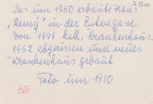 Schwarzweißfotografie. Diese Aufnahme aus dem Jahr 1910 zeigt die Vorderseite mit Haupteingang des Vorgängergebäudes des St. Josef Krankenhauses in Bendorf. Das Gebäude wurde im Jahr 1750 als Wohnhaus von Wilhelm Remy erbaut. Ab 1891 diente es als katholisches Krankenhaus. Im Jahre 1962 wurde es abgerissen und das heutige Marienhaus Klinikum St. Josef errichtet. Die Familie Remy prägte im 18. und 19. Jahrhundert durch ihre Unternehmen im Bergbau und Eisenhüttenwesen die Entwicklung der Stadt Bendorf wesentlich. Sie gaben vielen Menschen Arbeit und trugen somit zu bescheidenem Wohlstand in der Region bei. Gründer des Unternehmens war Wilhelm Remy (1702-1761), er betrieb Eisenhütten und Eisenerzgruben im Bezirk Bendorf. Weil seine Ehe mit Maria Elisabeth Hoffmann kinderlos blieb, nahm er seinen Schwager und Vetter Johannes (1713-1778) als Teilhaber in sein Unternehmen auf. Gemeinsam führten sie erfolgreich die Geschäfte. Der Erfolg bescherte Wilhelm eine seltene Auszeichnung seines Landesherrn, den Titel Kommerzienrat. Die Remys bauten prächtige Wohnhäuser sowie eine eigene Kirche für die reformierte Gemeinde. Johannes Remy und seine Gemahlin Johanette Elisabeth Remy (geb. Hoffmann) empfingen in ihrem Wohnhaus, heute ‘Untere Vallendarer Straße 19’, bekannte Persönlichkeiten von nah und fern, wie beispielsweise den Dichter Johann Wolfgang von Goethe. Die Familie Remy kümmerte sich auch um das Wohl der Bevölkerung und ihrer Arbeiter. Nach dem großen Brand 1743, bei dem die obere Ortshälfte von Bendorf vollständig niederbrannte, stellte die Familie Remy das Geld für den Wiederaufbau zur Verfügung. Da es damals keine Kranken- und Altersversicherung gab, führten sie die Knappschaftskasse ein, um ihre Arbeiter abzusichern und vor drohender Armut zu bewahren. Und das sechzig Jahre bevor Bismarck die Invalidenversicherung ins Leben rief. Die Remys organisierten außerdem Theaterabende als Wohltätigkeitsveranstaltungen, um mit dem Erlös arme Arbeiterfamilien zu unterstützen. Über 100 Jahre führte die Familie Remy das Unternehmen bis sie es 1870 an die Firma Krupp verkaufte.