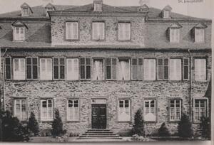 Schwarzweißfotografie. Diese Aufnahme aus dem Jahr 1910 zeigt die Vorderseite mit Haupteingang des Vorgängergebäudes des St. Josef Krankenhauses in Bendorf. Das Gebäude wurde im Jahr 1750 als Wohnhaus von Wilhelm Remy erbaut. Ab 1891 diente es als katholisches Krankenhaus. Im Jahre 1962 wurde es abgerissen und das heutige Marienhaus Klinikum St. Josef errichtet. Die Familie Remy prägte im 18. und 19. Jahrhundert durch ihre Unternehmen im Bergbau und Eisenhüttenwesen die Entwicklung der Stadt Bendorf wesentlich. Sie gaben vielen Menschen Arbeit und trugen somit zu bescheidenem Wohlstand in der Region bei. Gründer des Unternehmens war Wilhelm Remy (1702-1761), er betrieb Eisenhütten und Eisenerzgruben im Bezirk Bendorf. Weil seine Ehe mit Maria Elisabeth Hoffmann kinderlos blieb, nahm er seinen Schwager und Vetter Johannes (1713-1778) als Teilhaber in sein Unternehmen auf. Gemeinsam führten sie erfolgreich die Geschäfte. Der Erfolg bescherte Wilhelm eine seltene Auszeichnung seines Landesherrn, den Titel Kommerzienrat. Die Remys bauten prächtige Wohnhäuser sowie eine eigene Kirche für die reformierte Gemeinde. Johannes Remy und seine Gemahlin Johanette Elisabeth Remy (geb. Hoffmann) empfingen in ihrem Wohnhaus, heute ‘Untere Vallendarer Straße 19’, bekannte Persönlichkeiten von nah und fern, wie beispielsweise den Dichter Johann Wolfgang von Goethe. Die Familie Remy kümmerte sich auch um das Wohl der Bevölkerung und ihrer Arbeiter. Nach dem großen Brand 1743, bei dem die obere Ortshälfte von Bendorf vollständig niederbrannte, stellte die Familie Remy das Geld für den Wiederaufbau zur Verfügung. Da es damals keine Kranken- und Altersversicherung gab, führten sie die Knappschaftskasse ein, um ihre Arbeiter abzusichern und vor drohender Armut zu bewahren. Und das sechzig Jahre bevor Bismarck die Invalidenversicherung ins Leben rief. Die Remys organisierten außerdem Theaterabende als Wohltätigkeitsveranstaltungen, um mit dem Erlös arme Arbeiterfamilien zu unterstützen. Über 100 Jahre führte die Familie Remy das Unternehmen bis sie es 1870 an die Firma Krupp verkaufte.